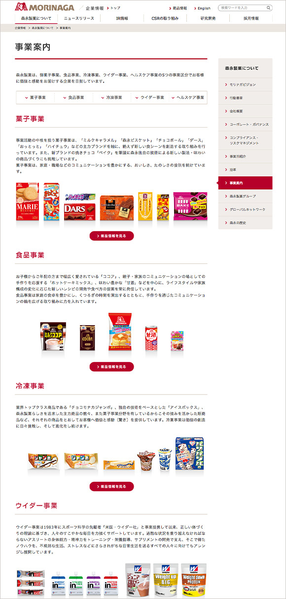 森永製菓株式会社のコーポレートサイトを担当しました。ブランド戦略を基にサイト構造を再設計し、ブランドイメージにあったデザイントーンを採用することで、より多くのステークホルダーに森永製菓の魅力が伝わるサイトを目指しました。担当したページは、全てマルチデバイスに対応しました。