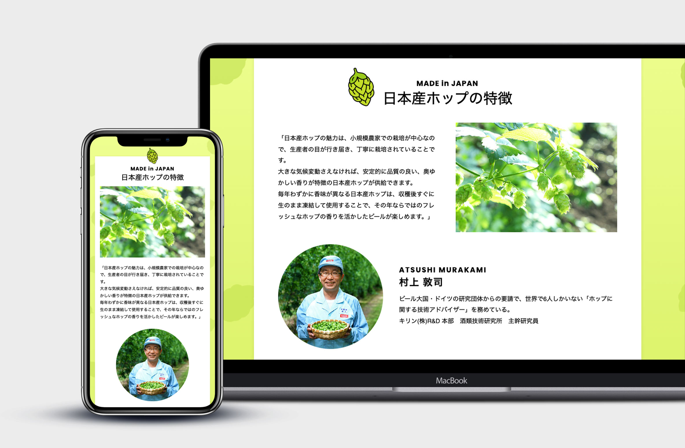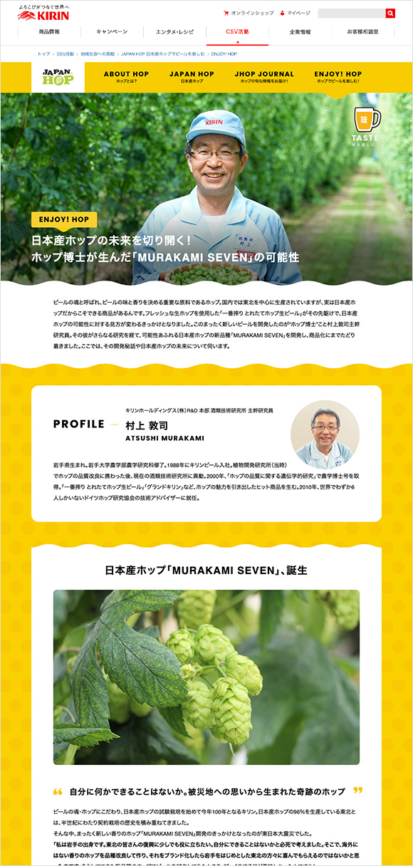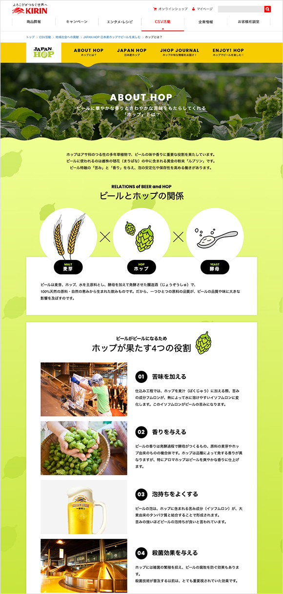 キリンの日本産ホップの取り組みをまとめた「JAPAN HOP 日本産ホップでビールを楽しむ」のスペシャルサイト。ホップの基礎知識から日本産ホップの特徴、ホップを通じた地域とKIRINの取り組みを紹介しています。